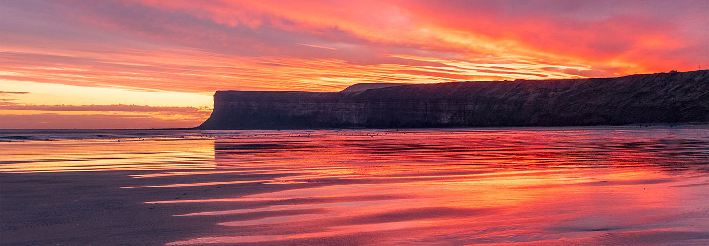 Explosions would be heard on this night as it was bonfire night however an explosion of colour was seen in the sky on that morning. Some stunning pre sunrise colour would surround the silhouette of Huntcliff while I used the wavy patterns left by the tide to almost mirror the cloud filled sky.
