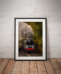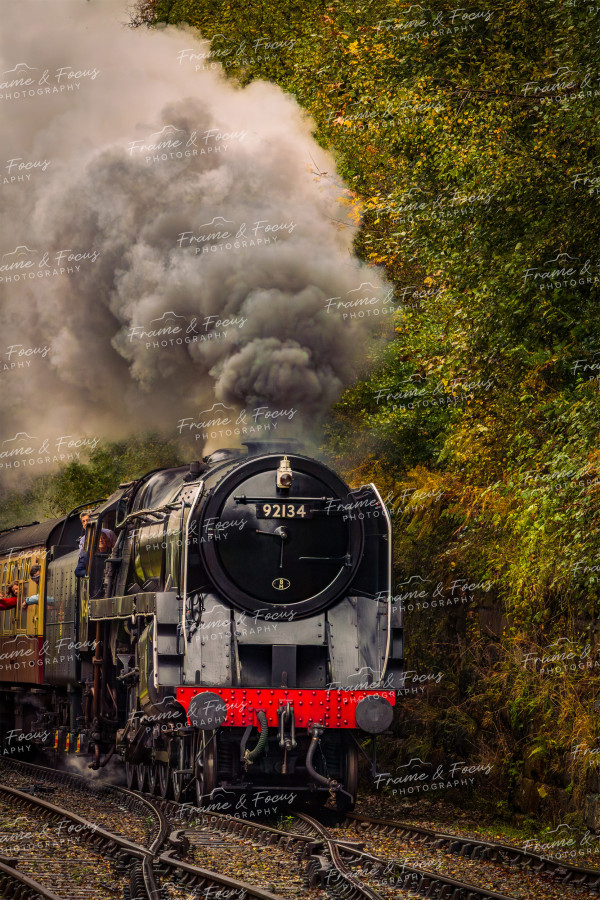 Having taken a day off work to capture the railway before it closed for the year me and Andrew headed for the popular station of Goathland. Also known as Hogsmeade from the Harry Potter films it is always a popular spot on the railway so visiting at the end of the season on a weekday was our best bet of capturing the photo we had planned. The plan was to capture the station from the bank opposite looking down but having checked the board we saw that a train was soon due from Grosmont so instead set up a shot that way waiting for the train to come. Unfortunately just as the train was arriving a member of the public arrived and leaned over the fence into my shot so I had to quickly adjust and zoom in to keep him and his camera phone out of my frame. Nevertheless I managed to get this shot of the 9F arriving into Goathland with plenty of steam as it pulled uphill into the station.